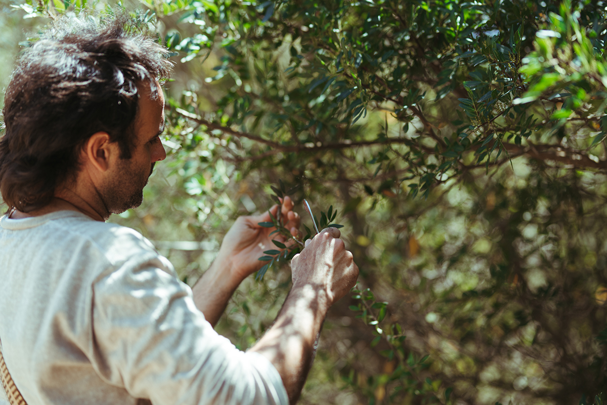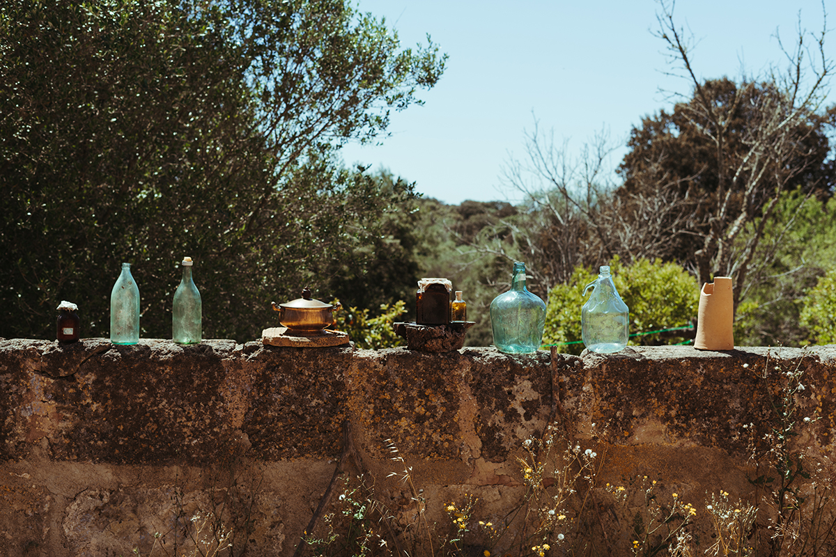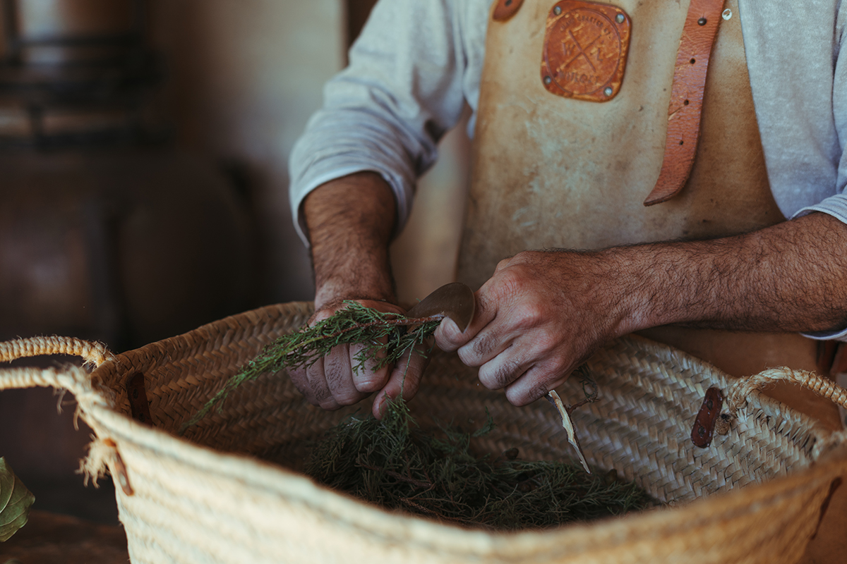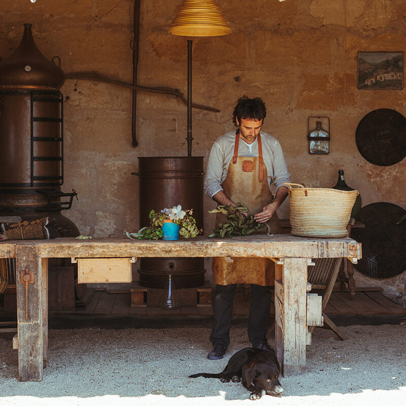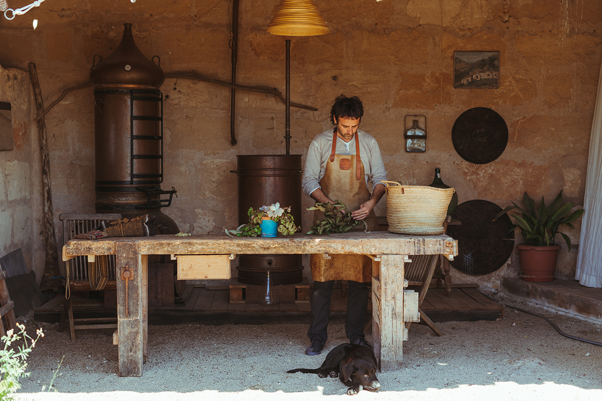 Juan destila quince plantas endémicas de la isla. Entre ellas están el romero, el tomillo, el laurel, el mirto y los cítricos. Las recolecta según la temporada, aplicando una cuidadosa rotación para garantizar que cada especie siga floreciendo. Pronto recogerá el antihistamínico natural helychrisum en las dunas de Mallorca.