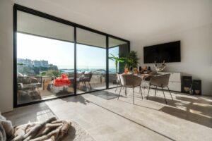 La entrada conduce a una amplia cocina abierta con comedor y sala de estar, que tiene acceso directo al balcón a través de puertas correderas de cristal, que ofrece impresionantes vistas al mar y al puerto.