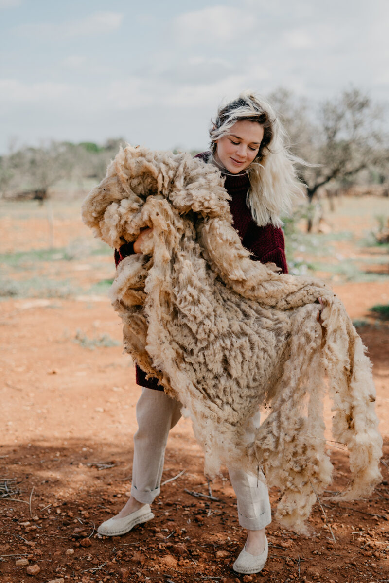 Después de estudiar moda en Barcelona en 2014, Adriana regresó a su isla natal, Mallorca. Creció originalmente en Cala Llombards, en la zona costera de Santanyí en una familia de ascendencia americana y francesa. Con su experiencia en el mundo de la moda ya había plantado la semilla para trabajar con telas, pero fue un día cualquiera en el que vio un pelaje de oveja lo que lo cambió todo. “Estaba extendido en una silla y recuerdo que me fijé en su forma. La forma en la que se doblaba sobre los brazos de la silla me intrigó”. La lana de oveja es uno de los principales materiales que usa Adriana, que lava, seca y estiliza para darle forma y luego la fija a la tela. La misma técnica se aplica también a la cuerda, la hierba y las hojas, que Adriana puede pasar hasta tres semanas trenzando para convertirlas en obras de arte.