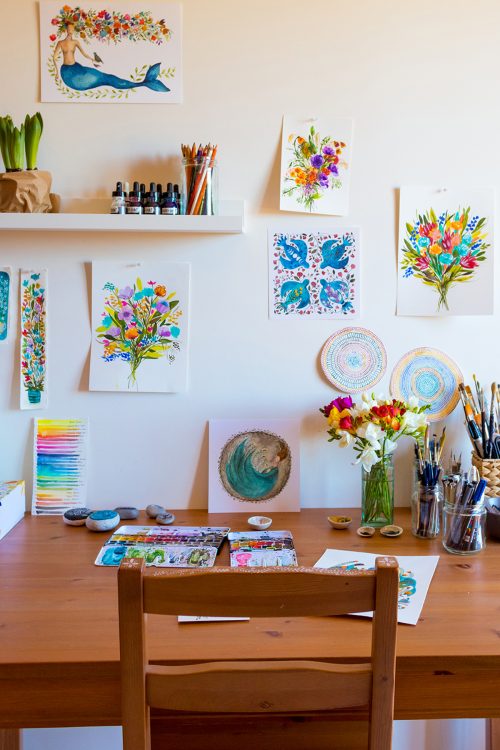 Las carpetas de dibujos de su estudio muestran que es una artista muy prolífica. Ella describe sus creaciones como diarios y cartas a amigos que ilustran acontecimientos de la vida y sentimientos, con colores diluidos e imaginería onírica. Hace poco que ha empezado a pintar piedras con pájaros y plumas; las vemos ahora esparcidas por su escritorio, como si fueran antiguos talismanes. Las piedras son estudios monocromáticos en blanco y negro o gris, un guiño a su época de boli y tinta.
