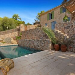 Inspirándose en los materiales tradicionales mallorquines, esta reforma integral realizada por Arquitectura 81, con sede en Portals Nous, ha preservado inmaculadamente el encanto rústico de esta propiedad de dos dormitorios. En el exterior de la casa de Esporles, las paredes de piedra natural se complementan con contraventanas de color verde oliva claro y, en la parte trasera, unos escalones bajan desde la terraza hasta la piscina de losas egipcias con bordes abujardados y una soleada zona chill-out. Desde aquí se disfruta de unas vistas impresionantes de la Sierra de Tramuntana. Los interiores elegantes, minimalistas y con acabados impecables dan un aire de tranquila sofisticación, con suelos de piedra Binissalem y paredes blancas que contrastan con la calidez de las vigas de madera. La chimenea de piedra tosca del salón y la pared de piedra vista del dormitorio hacen referencia a los orígenes rústicos de la propiedad y añaden textura y un carácter atemporal a la simplicidad de las paredes y los suelos.