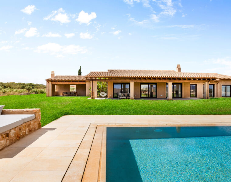 Luxury finca near Es Trenc beach with panoramic sea views, private pool, and landscaped gardens, offering a unique blend of modern and traditional design.