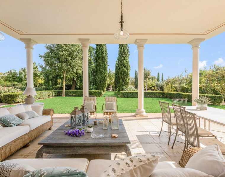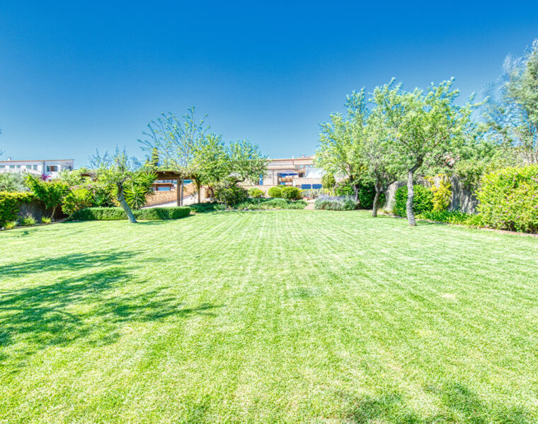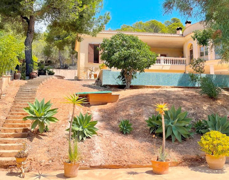 Esta hermosa villa familiar en venta en Paguera incluye preciosos techos altos, una gran piscina y un jardín mediterráneo con árboles frutales.