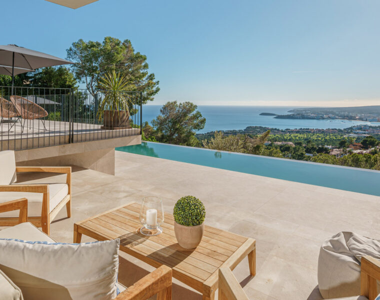 Esta villa en venta cerca de Santa Ponsa cuenta con espectaculares vistas al mar Mediterráneo gracias a su posición en lo alto de las colinas de Costa de la Calma.