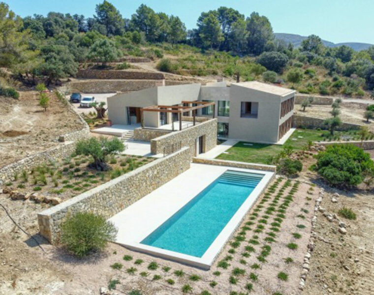 Una villa contemporánea cerca de Pollensa, que ofrece privacidad, diseño moderno, jardines paisajísticos, piscina y amplias terrazas para vivir al aire libre.