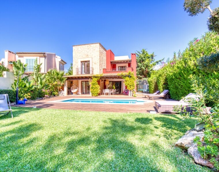Esta villa mediterránea de 6 dormitorios en venta en Santa Ponsa cuenta con un hermoso jardín frondoso, un diseño encantador y proximidad al mar.