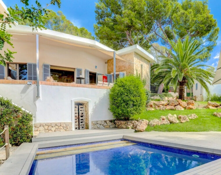 Este hermoso chalet independiente está situado en la zona de Calvià y cuenta con una piscina privada y vistas verdes desde su terraza.