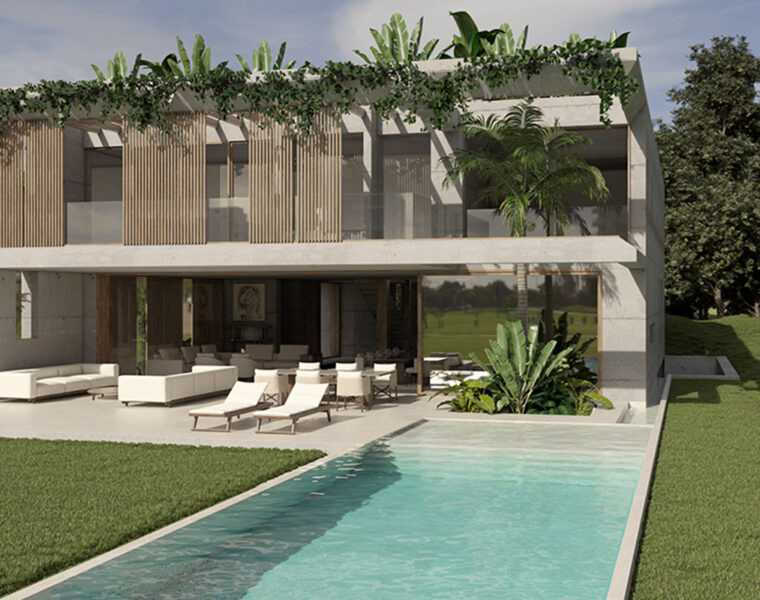 Esta villa, originalmente diseñada para una parcela en pendiente, está construida en varios niveles, proporcionando una sensación de desnivel con techos altos y vistas impresionantes. La propiedad cuenta con una fachada blanca brillante y una piscina infinita.