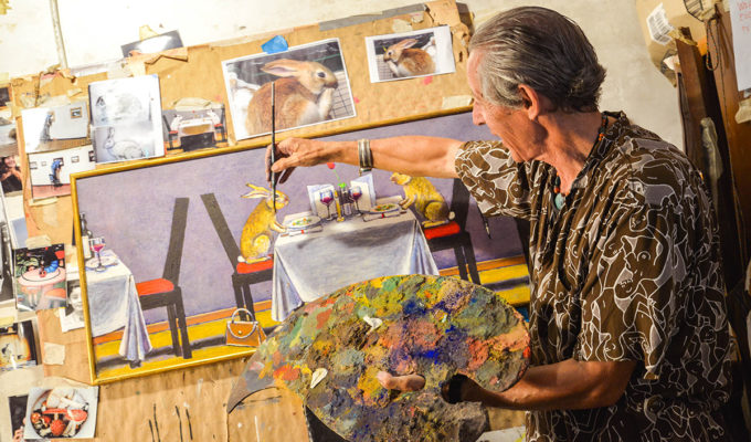Con el paso de los años Cecilie y George trabajaron muy duro para apoyar a los artistas locales, exhibiendo sus obras por toda la isla. La colección, en la que hay obras de ambos, se puede ver por todo el hotel. Dado el tiempo que llevan expuestas, tenemos curiosidad por saber cómo han evolucionado. “No es el Guggenheim, es un hotel que está en activo. Tuvimos que hacer un hueco para las televisiones, por ejemplo…” ¿Se produjo, entonces, una batalla entre el arte y la tecnología? “la tecnología es una herramienta, no un arma.” Contesta Cecilie con un brillo especial en los ojos.