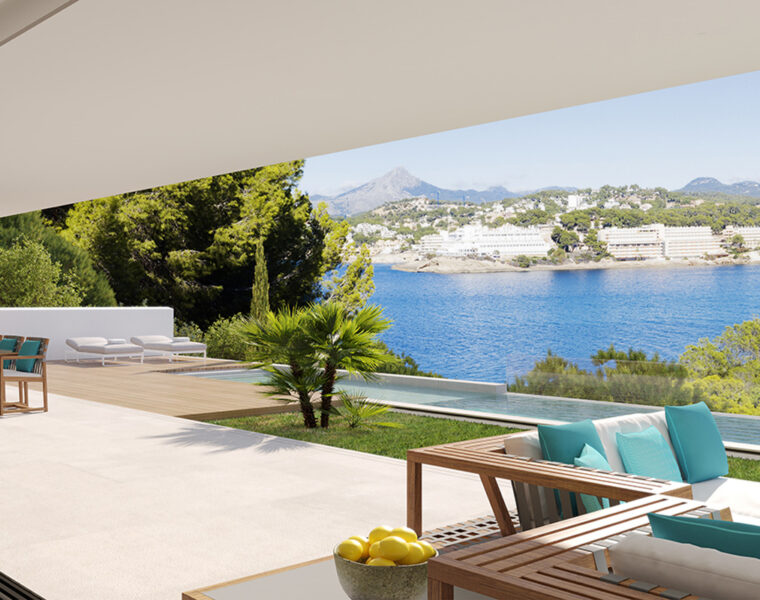 Preciosa y moderna propiedad mediterránea en venta en Santa Ponsa con vistas al mar, amplio jardín y piscina.