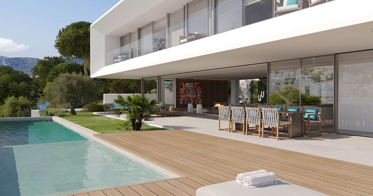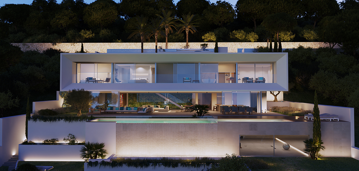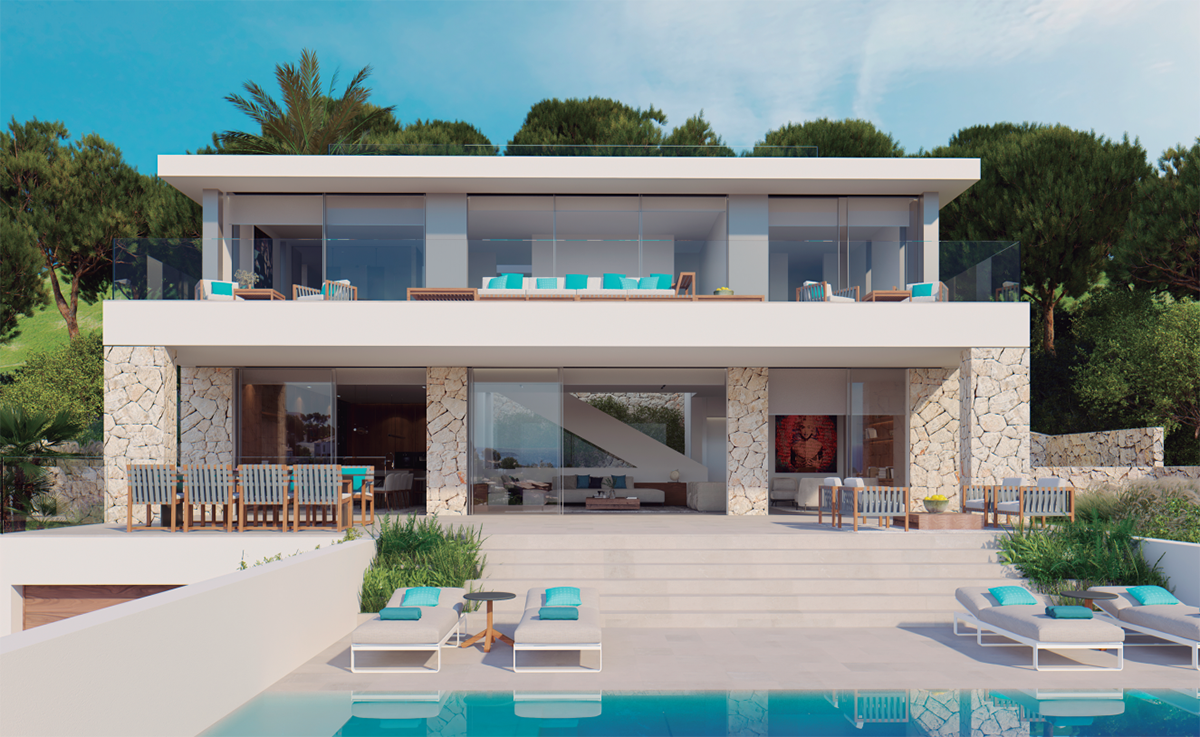 Preciosa y moderna propiedad mediterránea en venta en Santa Ponsa con vistas al mar, amplio jardín y piscina.