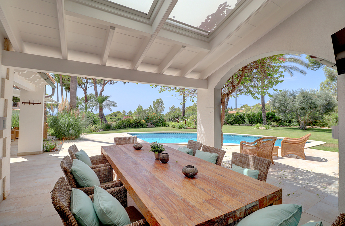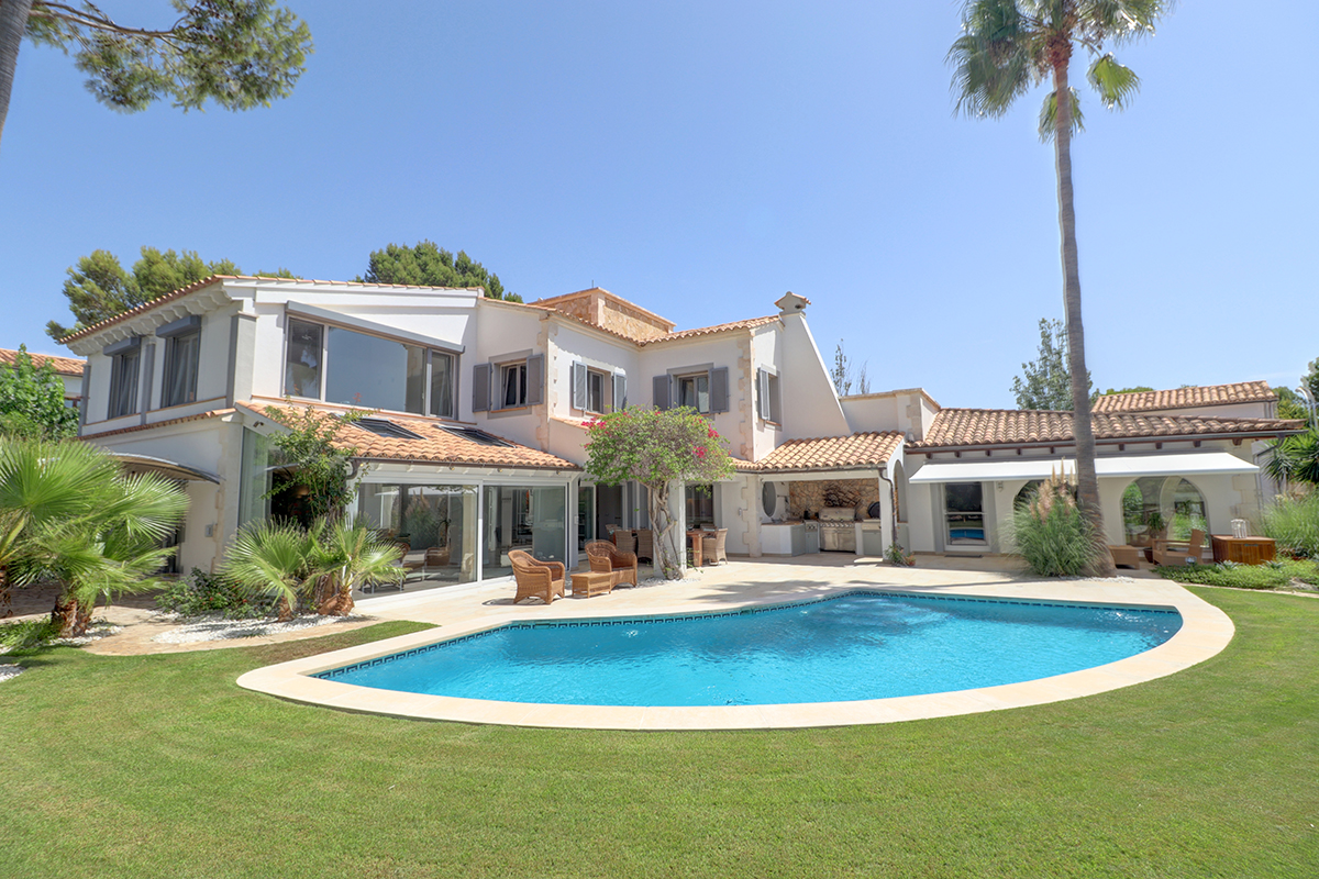Con vistas al golf y a la montaña, piscina privada y apartamento de invitados, esta villa de Santa Ponsa ofrece un estilo de vida excepcional.