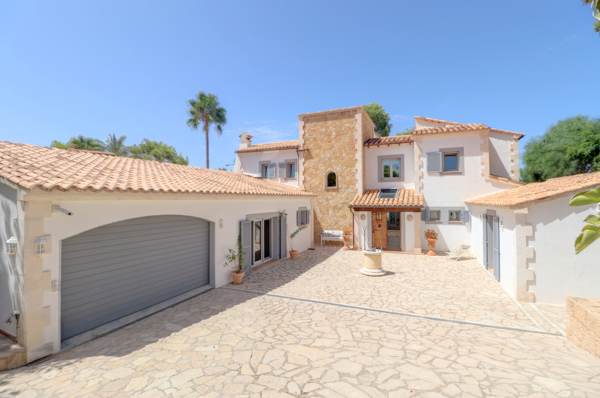 Preciosa villa de 4 dormitorios en venta en Santa Ponsa con aparcamiento para ocho coches, zona de barbacoa y azotea con cocina propia.