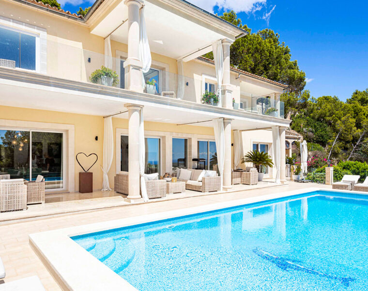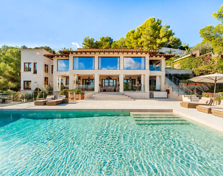 Hermosa villa con vistas al mar en venta cerca de Port Andratx viene con 5 dormitorios, cocina de verano, cine en casa y zona de bienestar.