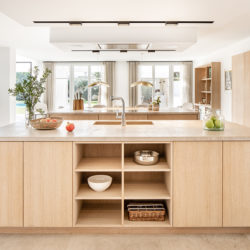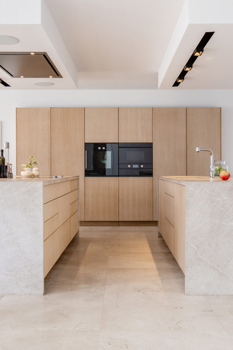 Junto con Perlentaucher como promotor supervisando el proceso, Espacio Home Design cumplió todos los requisitos instalando una cocina de Cocinart y usando materiales mediterráneos. Se han instalado armarios de roble natural, incluyendo dos grandes islas en el centro de la cocina. Las placas de inducción, el horno y el microondas son de la marca de lujo Gaggenau.