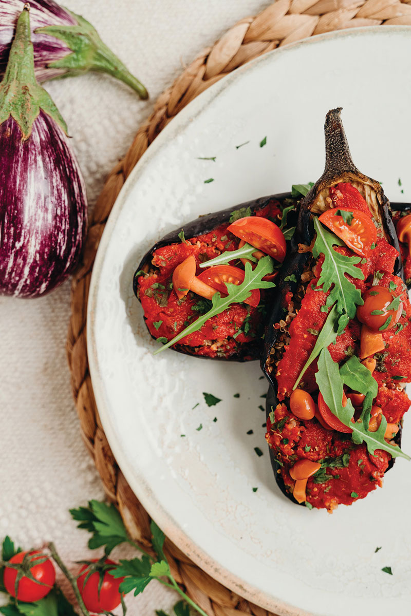 Una versión vegetariana y saludable del tradicional plato de berenjenas rellenas de Mallorca conocido como “berenjenas a la mallorquina”. Se trata de un plato típico de verano, ya que es cuando las berenjenas están en temporada. El relleno de este plato está hecho de setas y cebollas, cubierto con una salsa de tomate casera y se puede servir con una ensalada verde fresca – ¡Buen provecho!