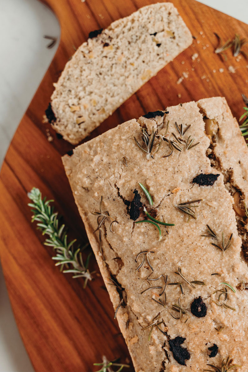 Pan de aceitunas y romero elaborado con aceite de oliva de Valldemossa y sal marina de Es Trenc. Bajo en carbohidratos y sin gluten, ¡un bocadillo perfecto y nutritivo!