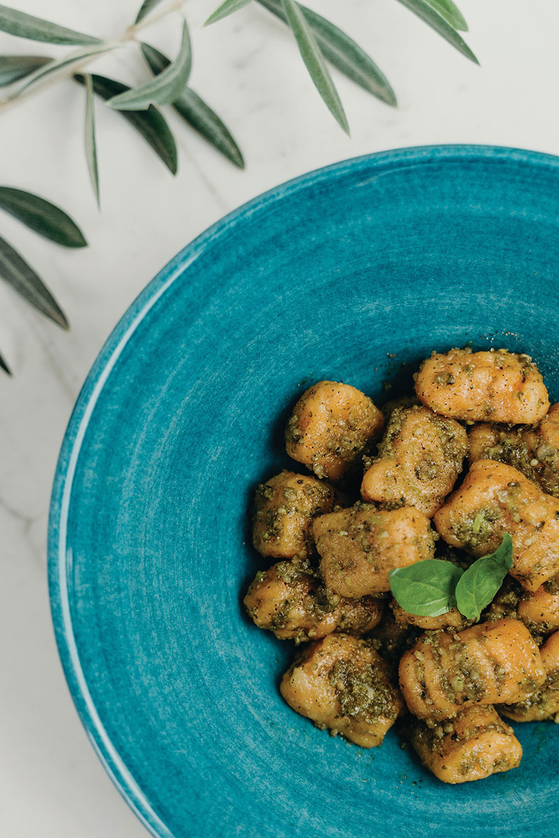 Una sencilla y deliciosa comida reconfortante que puedes cocinar en casa. Gnocchi caseros hechos con calabaza orgánica y servidos con un pesto de semillas de girasol con hierbas para terminar el plato-una opción perfecta para el almuerzo o la cena.
