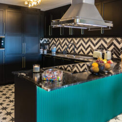 Los elegantes patrones en blanco y negro son un tema constante en la mayor parte del apartamento, pero con variaciones para distinguir los distintos espacios: papel pintado verde con textura de cocodrilo en uno, y art decó floral en otro. Los bloques de paneles turquesa combinan con el rosa del sofá hecho a medida. Las puertas de vidrieras originales de los años sesenta se reutilizaron para hacer armarios empotrados. La iluminación también se diseñó para ser un poco “más sexy que una casa normal”, explica Cristina.