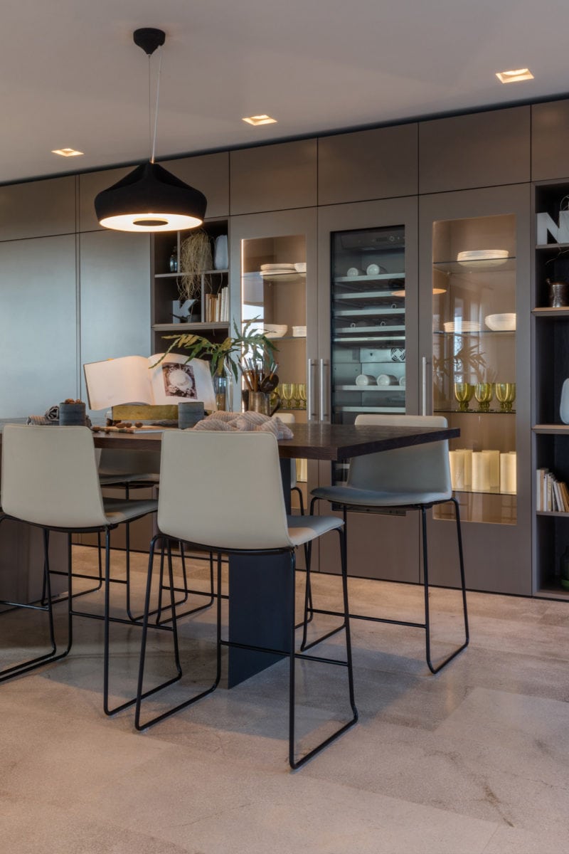 Los electrodomésticos elegidos por Espacio Home Design fueron todos de la marca de lujo Gaggenau, incluyendo el elegante botellero. Los extractores son de Gutmann y el lavavajillas es de Miele.