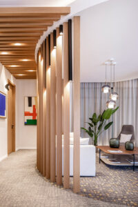 A pesar de su asociación con los viajes de ultralujo, el concepto principal del proyecto era “sentirse como en casa”, explica Marga Comas. Y los espacios, elegantes pero desenfadados, están diseñados con mucho arte para que el cliente se sienta así. Las paredes de madera clara de diferentes formas y tamaños crean recintos visuales que definen las distintas zonas, proporcionando una sensación de intimidad. Los suelos enmoquetados también absorben el ruido exterior, lo que contribuye a crear una atmósfera de calma y tranquilidad.