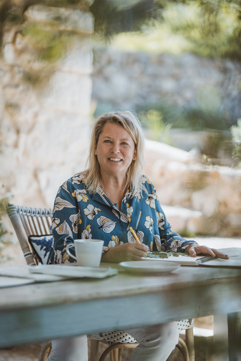 Antes de mudarse a Mallorca, había vivido principalmente entre el Reino Unido y Asia, dirigiendo una exitosa empresa de producción cinematográfica. Pero después de más de dos décadas, era hora de “colgar las botas de productor y sacar la caja de pinturas”. Y como muchos, fue durante el confinamiento cuando Mel sintió que de repente tenía tiempo para parar y observar realmente la naturaleza que la rodeaba. Inspirada por la flora autóctona, “los diseños de telas empezaron a dominar mi vida y a alimentar mi alma y mi bienestar”.