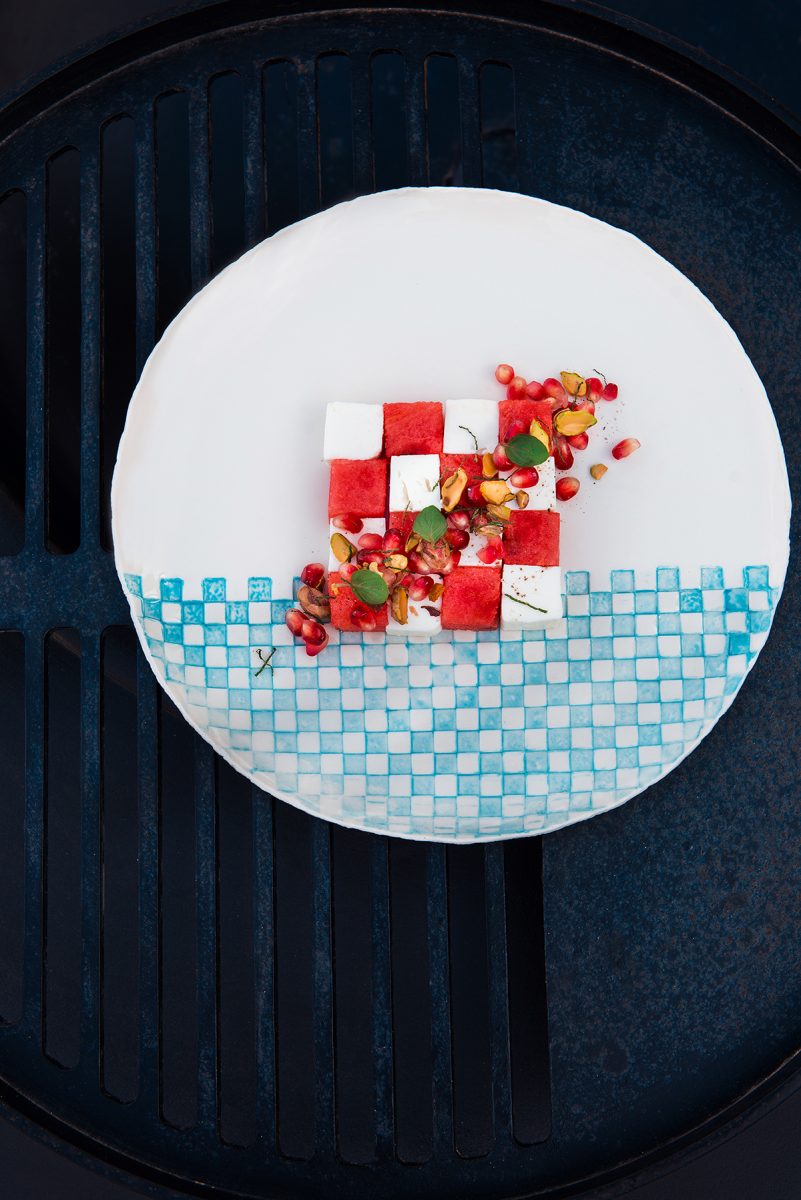 Poner la sandía y el queso feta en el plato a modo de tablero de ajedrez.
