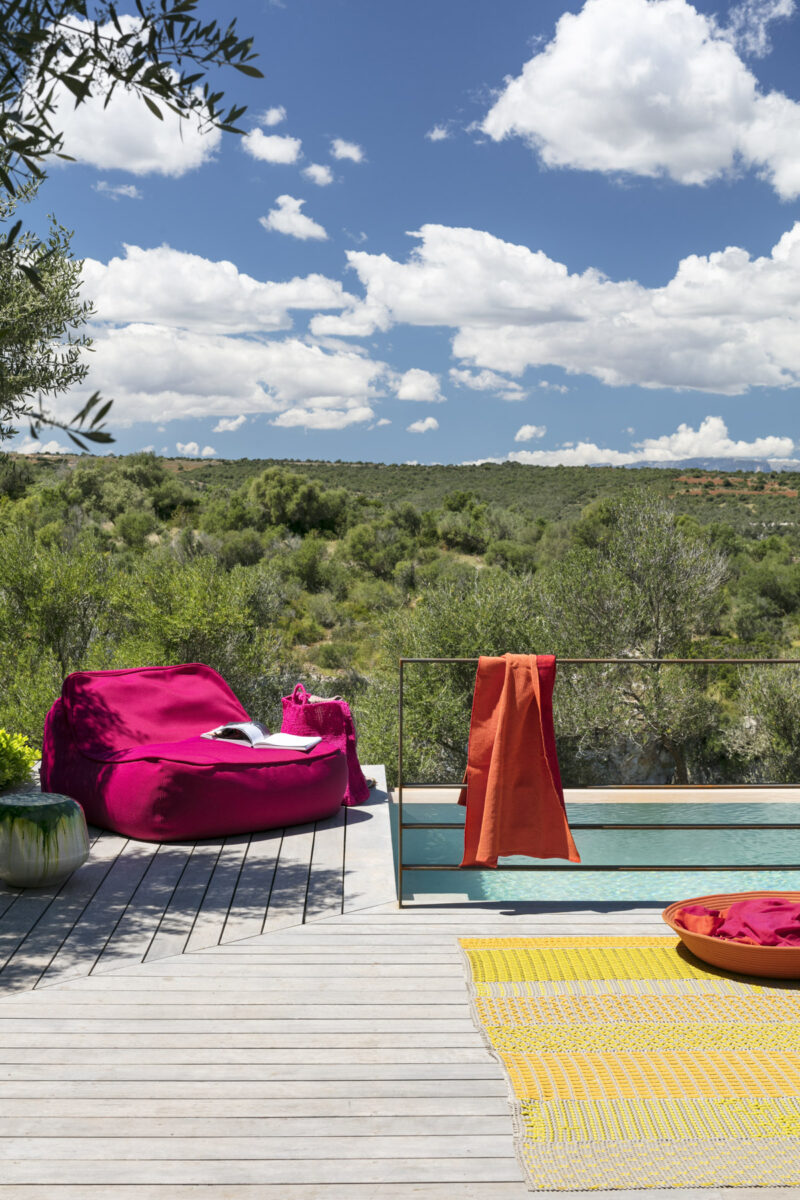 También destacan sus zonas exteriores. Aquaquae ha querido integrar la casa en el paisaje que la rodea, y al mismo tiempo salpicarla con colores atrevidos de marcas exclusivas como Paola Lenti y Roda. El resultado es un maravilloso juego de tonos vibrantes que se mezclan con tonos más terrosos.