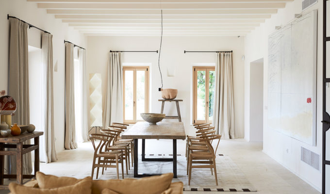 Desde las paredes suavemente redondeadas y sutilmente texturizadas, hasta la relajante paleta cromática, que flota entre la arenisca, el yute y varios tonos de maderas sin barnizar, los interiores son la imagen de la tranquilidad. Una serenidad parece irradiar desde los viejos muros de piedra, fomentando la reflexión y la meditación. En su interior encontramos robusta ropa de cama, cortinas de cáñamo tejidas a mano, singulares alfombras y obras de arte de artistas mallorquines, Es Racó también es una oda al buen gusto.