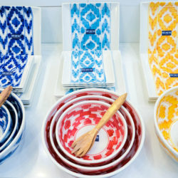 Fueron los primeros en aplicar los diseños de las telas de lenguas a la cerámica; sus colecciones de alfarería, telas y vajillas están diseñadas para combinarse maravillosamente. Con su especial uso del diseño tradicional de la isla, Estilo Sant Feliu se dedica a algo más que a producir objetos de belleza, asegurando la continuación de una leyenda que comenzó hace ya siglos con la ruta de la seda. Muchos creen que así es como la técnica ikat llegó a Mallorca, y la imagen de los distintivos rombos y flechas difuminados ha sido un pilar del diseño mallorquín durante cientos de años; Estilo Sant Feliu es otro capítulo en el viaje de su supervivencia.