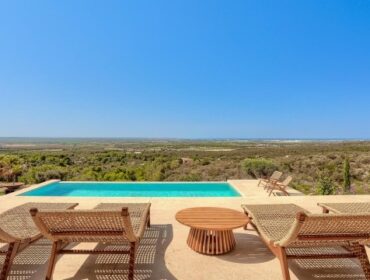 Finca de lujo cerca de la playa de Es Trenc con vistas panorámicas al mar, piscina privada y jardines paisajísticos, que ofrece una mezcla única de diseño moderno y tradicional.