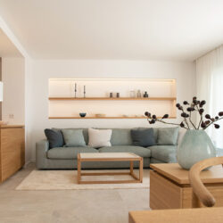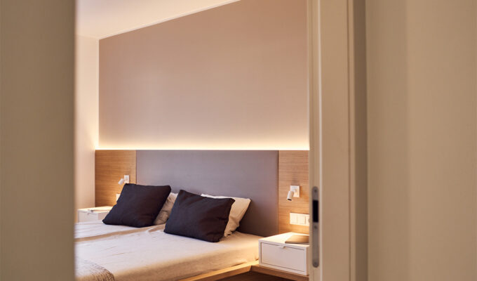 La conexión espacial entre las zonas de estar y dormitorio está formada por un largo y estrecho pasillo que se ha abierto en la parte superior. Una claraboya de cuerpo entero transforma el espacio, hasta entonces poco inspirador, en un impresionante juego de luces y sombras. Los cuatro dormitorios y cuartos de baño contiguos continúan el diseño minimalista pero claramente mediterráneo.