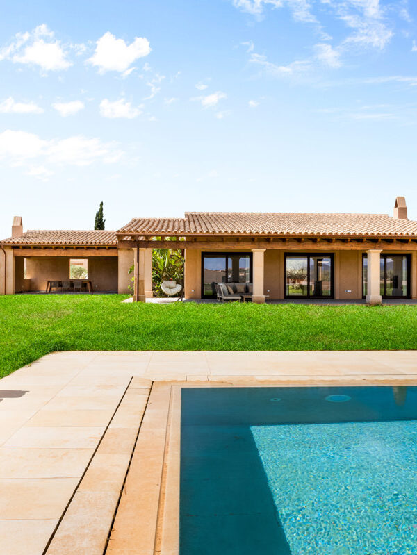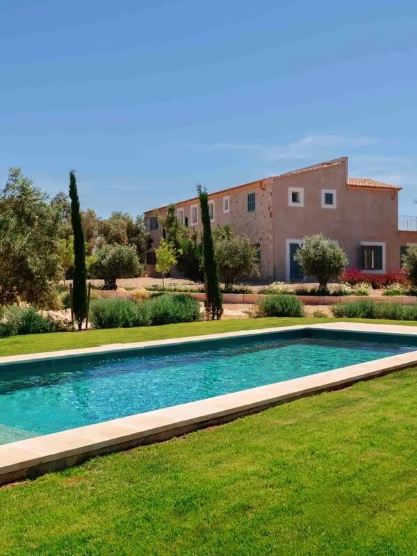 Luxury finca near Es Trenc beach with panoramic sea views, private pool, and landscaped gardens, offering a unique blend of modern and traditional design.