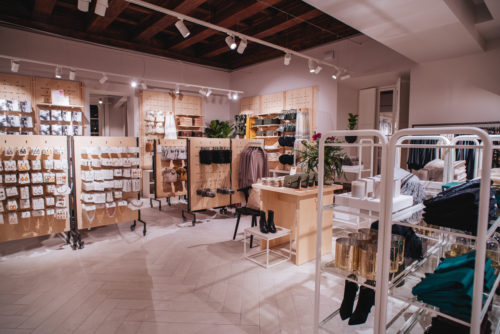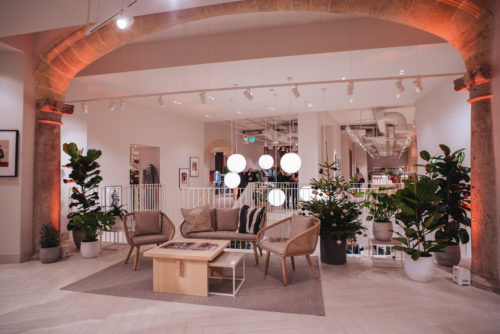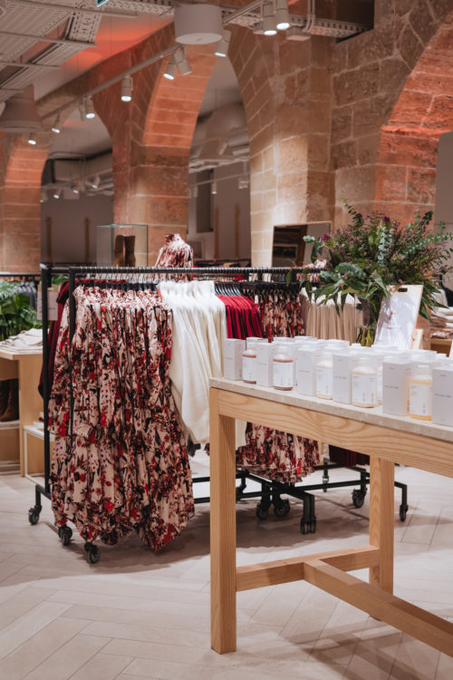 H&M ha incorporado en esta reforma un diseño minimalista que mezcla a la perfección colores y estampados alegres y elegantes. El objetivo de la reforma estaba claro desde el inicio: mantener la estética original del edificio, algo que se ha conseguido sacando a la luz las zonas medievales originales del edificio, como arcos de piedra y ladrillos de piedra mallorquina.