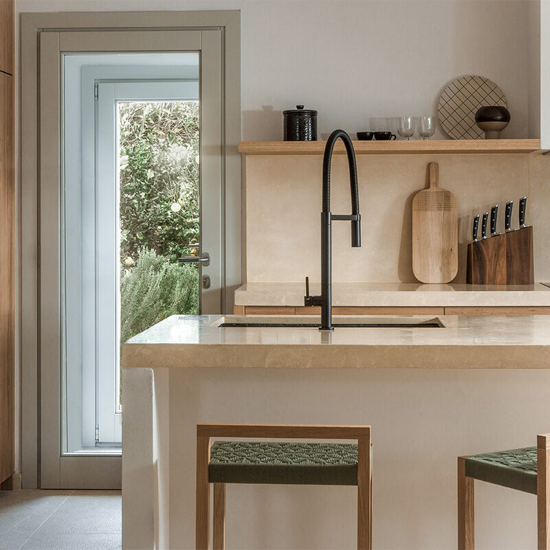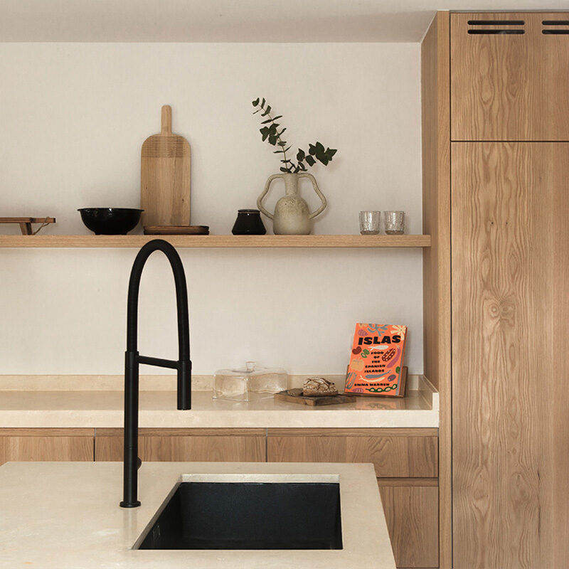 El proyecto también se basó en diseñadores y artistas mallorquines para garantizar que los interiores también tuvieran una conexión con la isla. Los fregaderos de hormigón oscuro con virutas de terrazo, los armarios de cocina de madera natural y las encimeras de piedra fueron hechos a medida por artesanos locales, mientras que gran parte del mobiliario se obtuvo de estudios radicados en la isla como Contain y Jaia. Para el estilismo, incorporaron la decoración del artista mallorquín Diego Sánchez Barceló, y los clientes eligieron obras de arte del artista de Pollensa, Joan Bennàssar. Y la propia luz mallorquina desempeña un papel importante a la hora de unir todo: “El proyecto cobra vida con la hermosa luz del sol que entra por las ventanas”, afirma Anna.