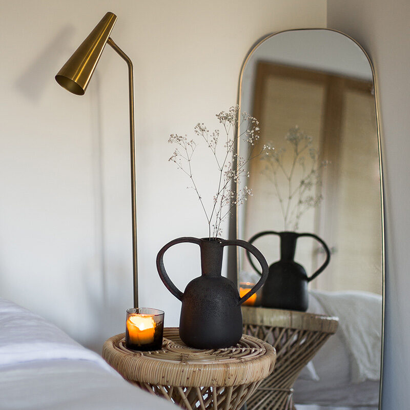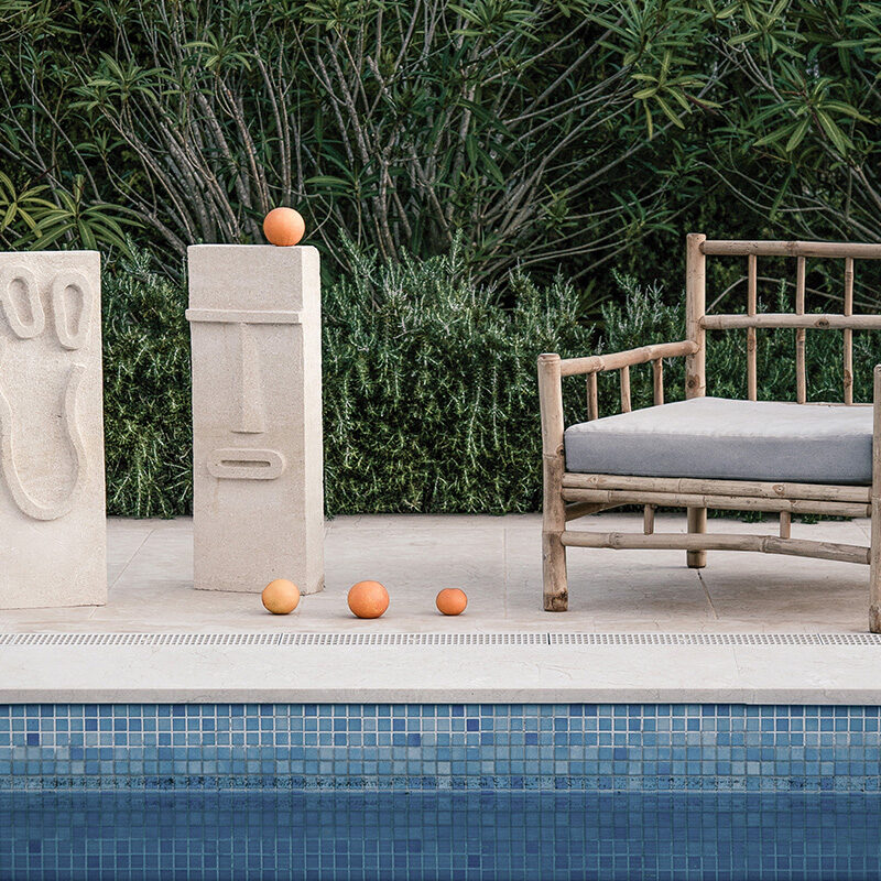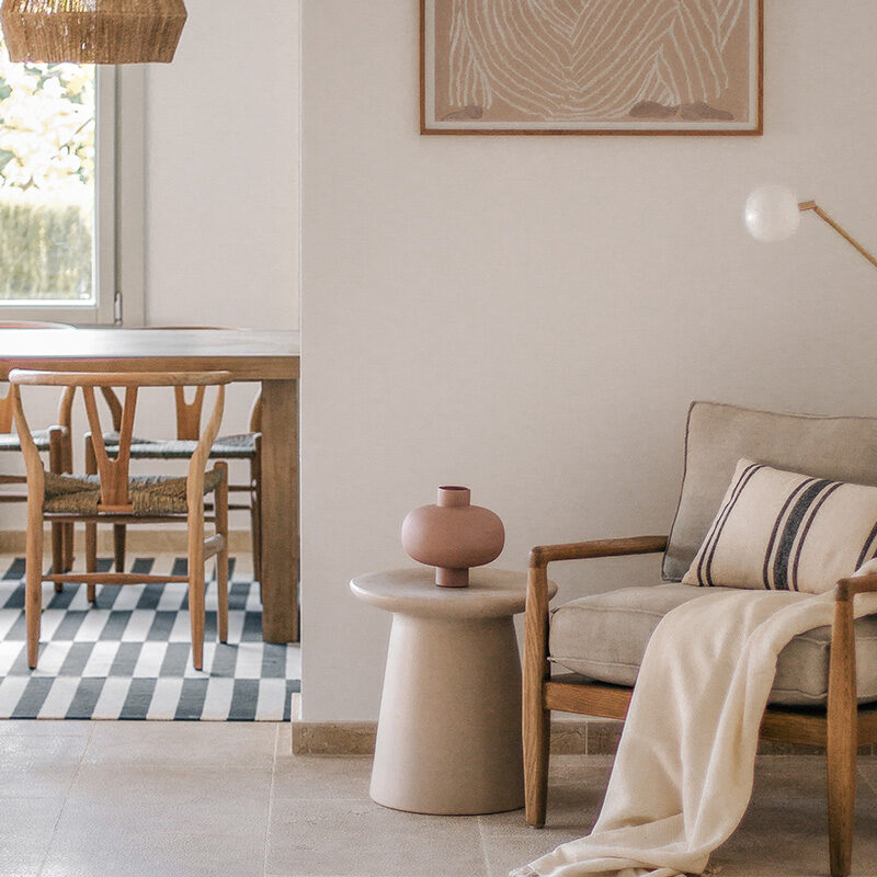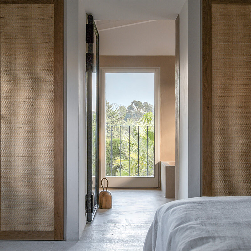 Como reflejo del entorno natural, emplearon materiales como el roble, el ratán y el bambú, para aportar también carácter e intimidad a la casa: “para crear un espacio que fuera acogedor desde el momento en que se entra en la casa”, explica Anna. Las paredes se pintaron en blanco roto para aportar calidez a los interiores, mientras que aplicaron una técnica especial de abujardado a las baldosas de piedra existentes para darles un toque más suave y rústico. Otros aspectos más modernos son los suelos de microcemento en todos los baños, que crean un contrapunto fresco a los elementos más cálidos y hogareños. Las lámparas de diseño también aportan un toque de elegancia contemporánea, con lámparas de marcas como Cestita, Miguel Milá y Menu Space.