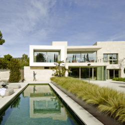 En los luminosos pasillos la piedra caliza de color crema adquiere todo el protagonismo. En ciertos tramos se han colocado lamas curvas de madera de roble, que desafían la uniformidad de los ángulos rectos que pueden encontrarse en prácticamente toda la propiedad. Las paredes transparentes de vidrio conectan los espacios interiores, entre los que destaca una reluciente piscina revestida con mosaico, garantizando así la abundancia de luz natural. Además, se puede disfrutar de las vistas a los jardines circundantes desde múltiples puntos de la vivienda.