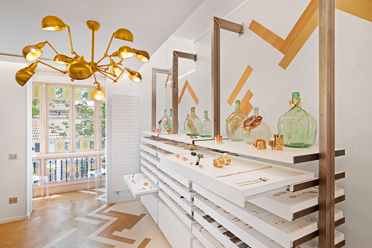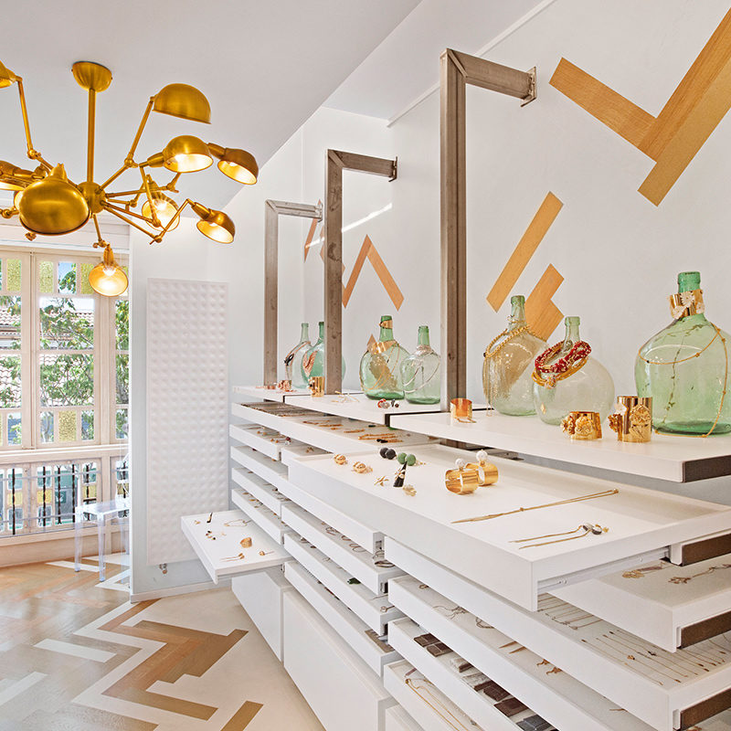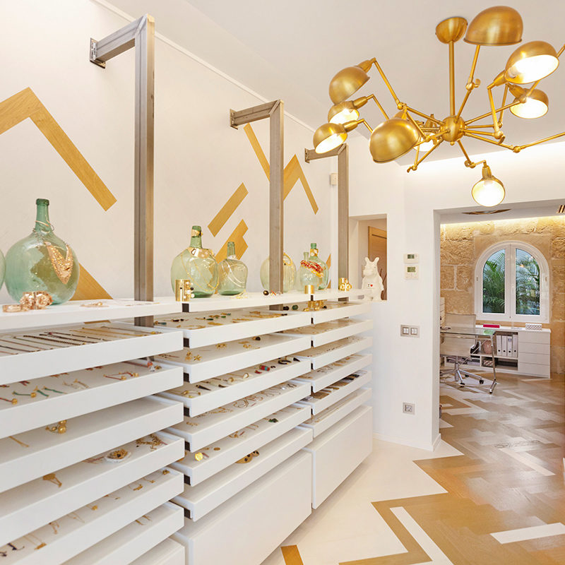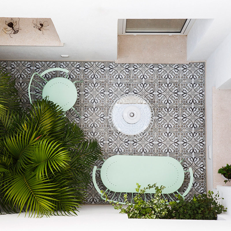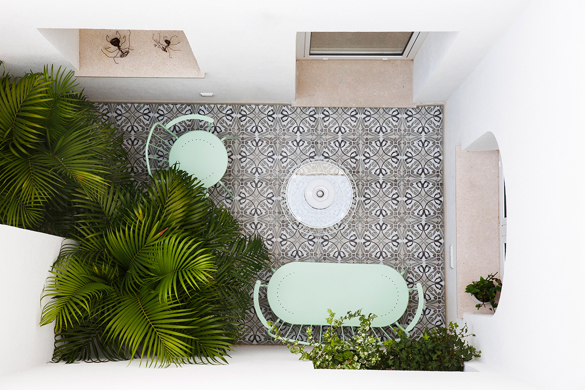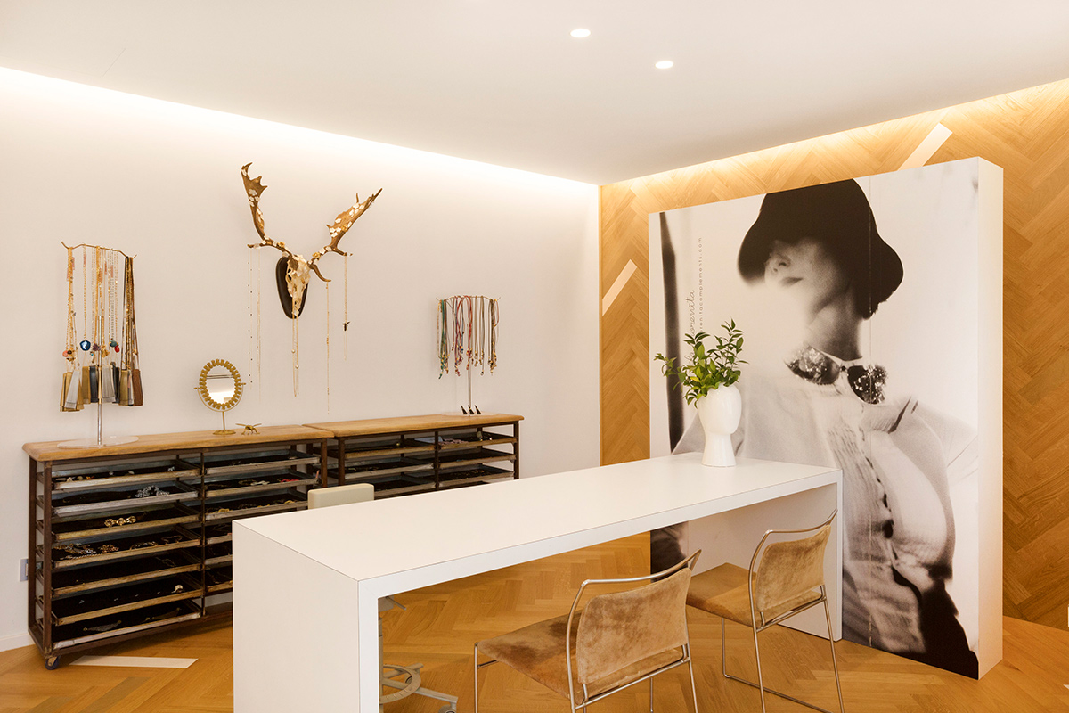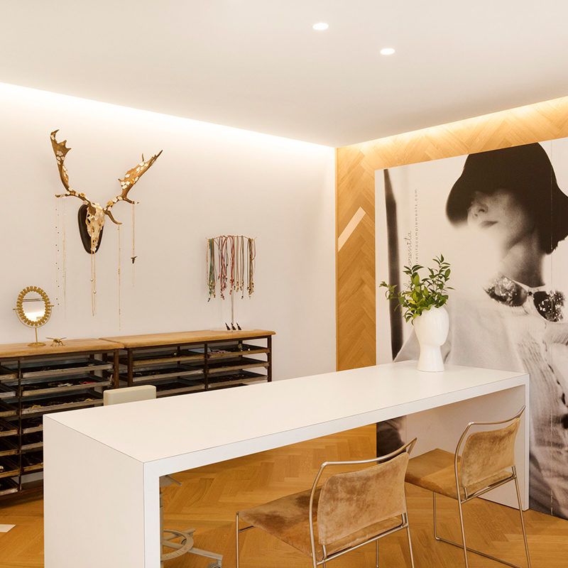 Tal y como es de esperar de un showroom, la iluminación juega un papel importante en el espacio – tanto la natural como la artificial, utilizando una combinación de puntos discretos y luces de fondo con una llamativa característica de iluminación aracnoidea. El edificio también es parte de la casa de Alma, por lo que también hay una intimidad en el espacio, que incluye un patio apartado donde la diseñadora de joyas se puede relajar entre ornamentados mosaicos hidráulicos y vegetación abundante. Varios objetos rescatados los mercadillos de alrededor de la isla (cráneos de animales, botellas, bandejas antiguas) rompen con la línea decorativa y añaden un inesperado y acertado toque vintage.