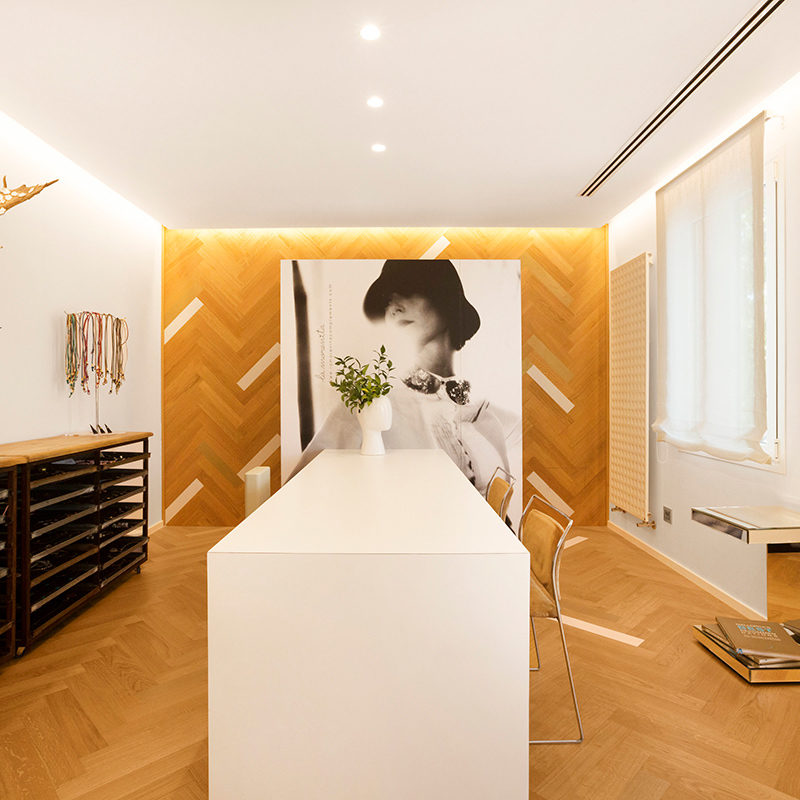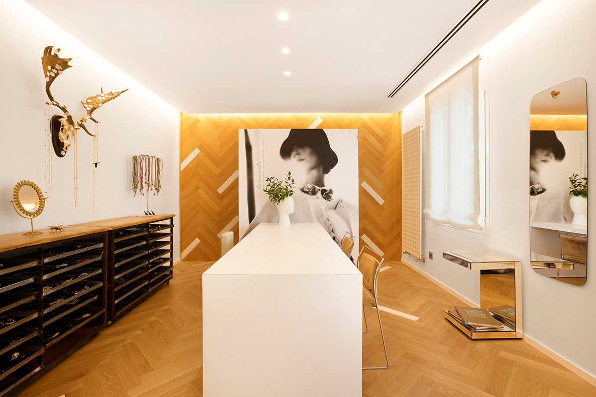 La mente creativa detrás del espacio es la propia hermana de Alma, la diseñadora de interiores Hada López, con su visión ejecutada por Alibaz Construcción. Para conseguir este maravilloso espacio ha empleado una variedad de oro cálido y blanco puro, haciéndose eco de los metales brillantes en el trabajo de su hermana, así como el marés del edificio original. Los elementos Art Decó se caracterizan por los detalles de roble tallados a mano, así como por el parquet de espina que se mueve de la madera tradicional hacia la combinación de blanco y dorado, y trepa las paredes animadamente.