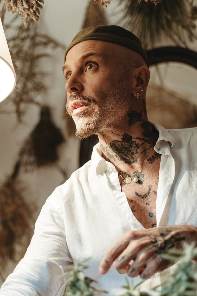 El objetivo del antiguo florista es profundizar en la relajación y la exploración espiritual con herramientas que sanan en lugar de dañar la naturaleza. Las velas se fabrican con cera vegetal. Cuando se calienta, se convierte en una manteca ideal para el masaje. Las cáscaras de coco son aptas para su reutilización o para el compostaje. No soy un chamán ni un gurú. Simplemente dejo hablar a los visitantes de mi taller de Son Armadams. Así pueden encontrar o diseñar lo que necesitan para potenciar su poder interior’. A pesar de su humildad, con su bigote Lucas tiene una figura llamativa. Gran parte de su delgado cuerpo está cubierto de cautivadores tatuajes. Son reliquias de otra vida”, sonríe, “pero estoy orgulloso de ellos”.