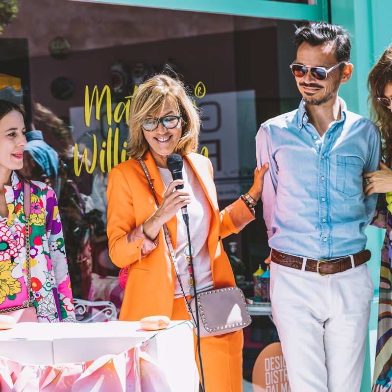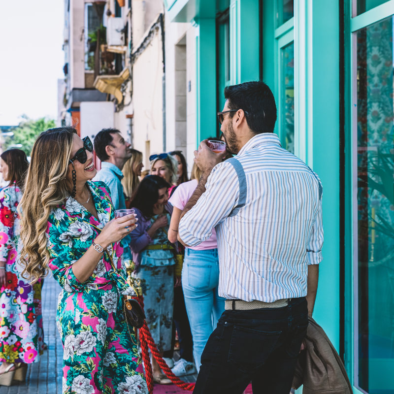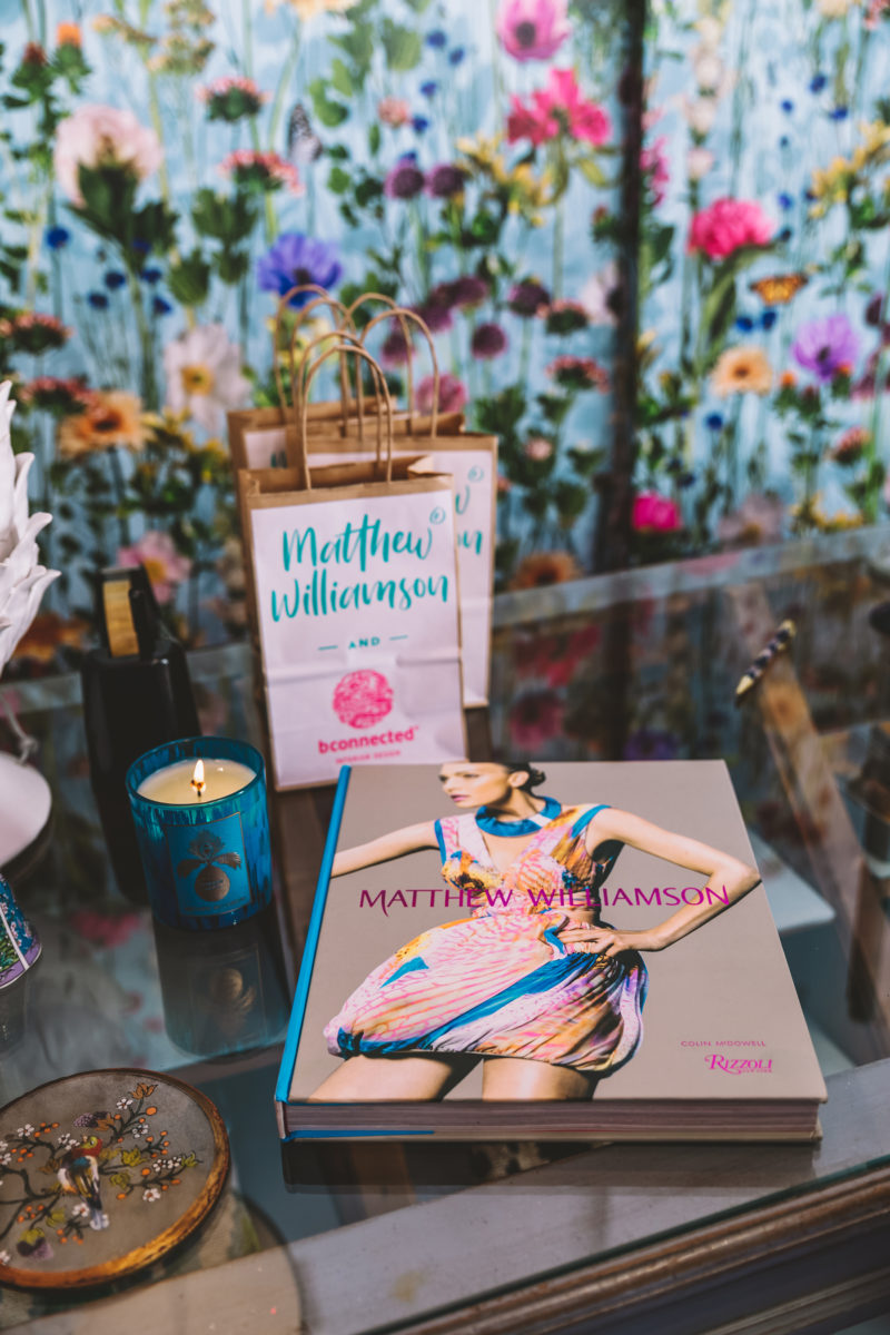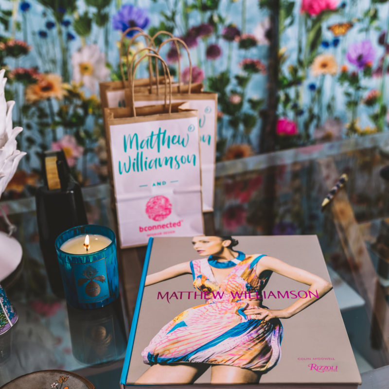 La tienda de Bconnected y el nuevo showroom de Matthew Williamson se encuentran frente a frente; flores gigantescas, figuras de papel y cintas de colores adornan la calle donde los invitados conversan alegremente y disfrutan de las melodías suaves del DJ.