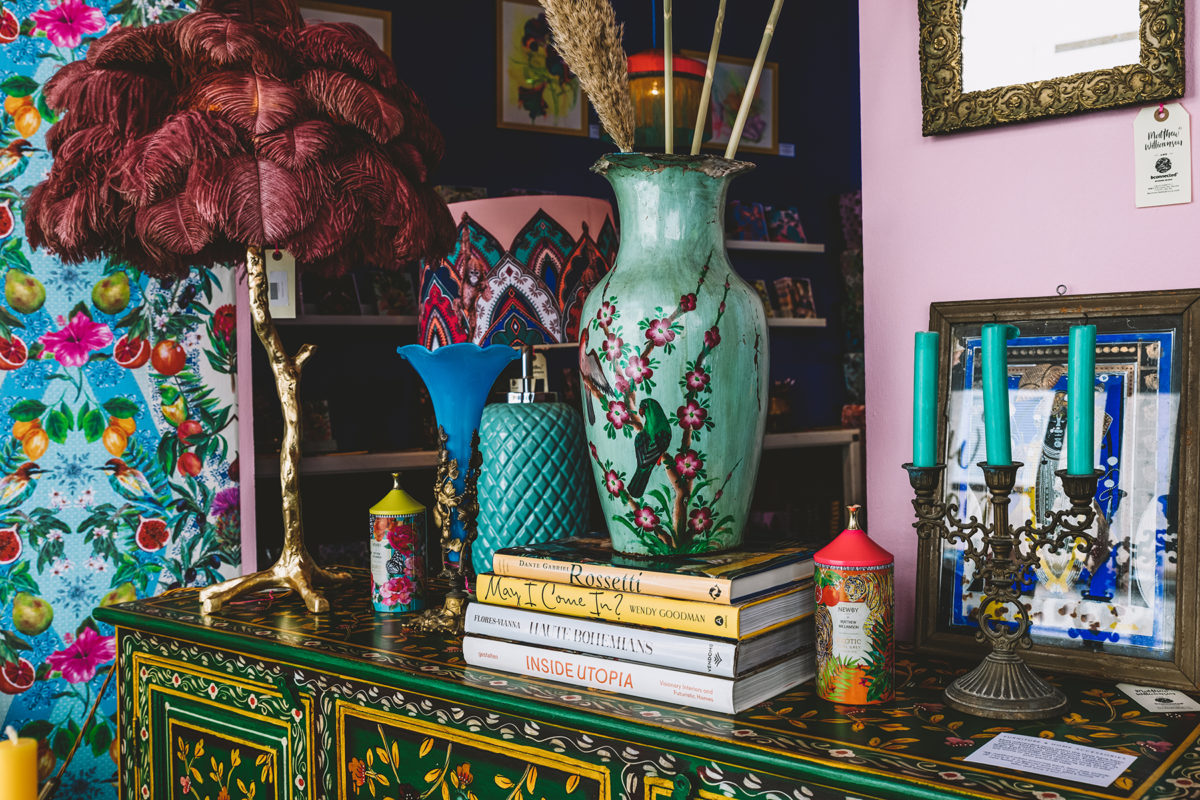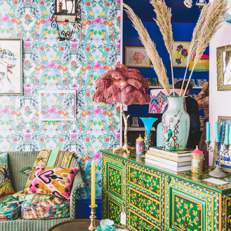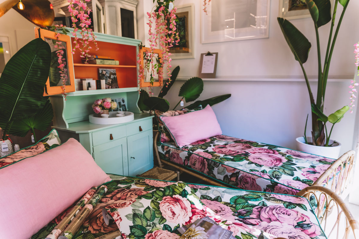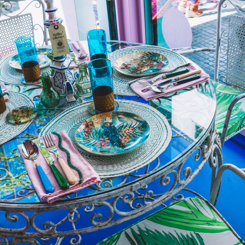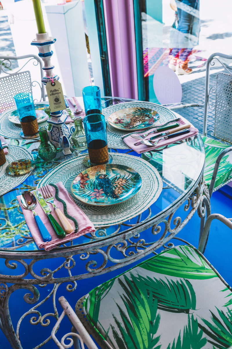 El showroom tiene colores vivos y estampados únicos, donde la vista va sola de un lado a otro. Desde pequeños detalles como tazas de té en forma de pétalos y velas de cerámica de lujo hasta piezas de decoración más llamativas, como por ejemplo un armario-aparador de cristal, el local está lleno de inspiración para aquellos que quieran añadir un toque de color a su hogar. Ambos diseñadores han combinado sus estilos a la perfección, usando colores complementarios para crear algo que evoca a un “sueño tropical”.