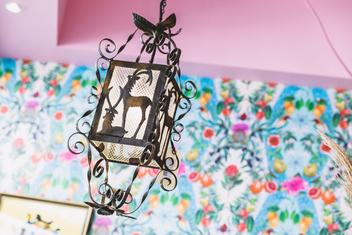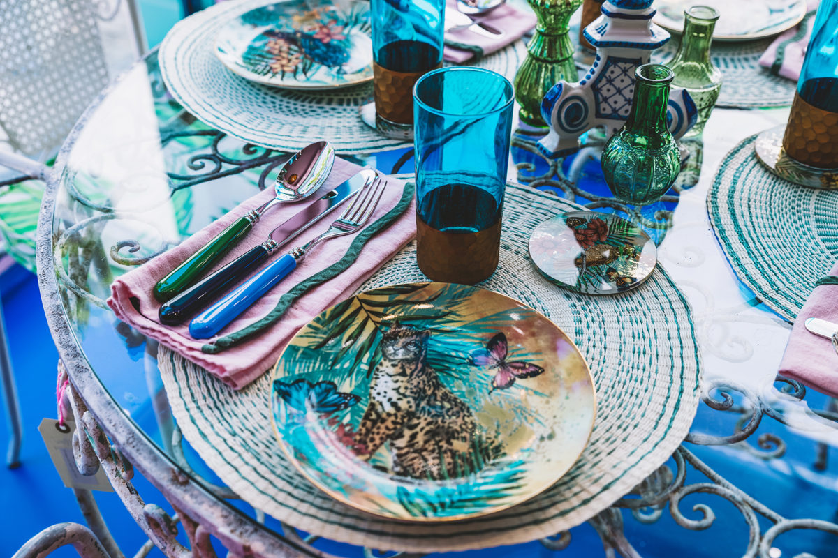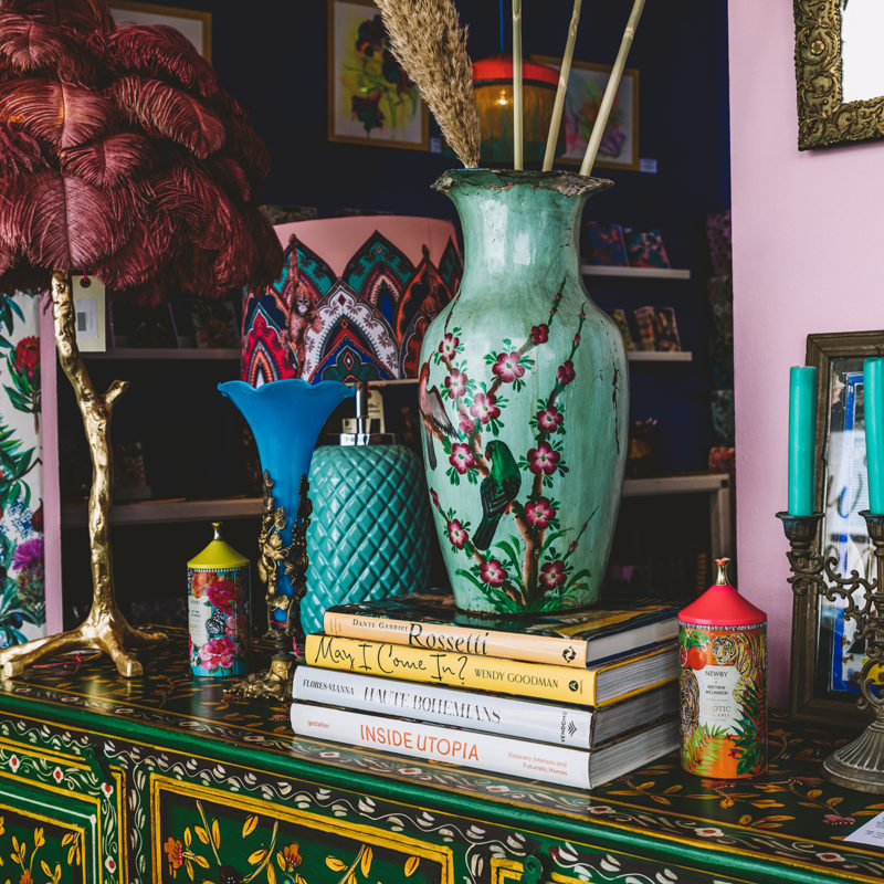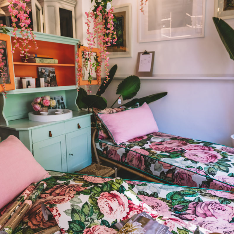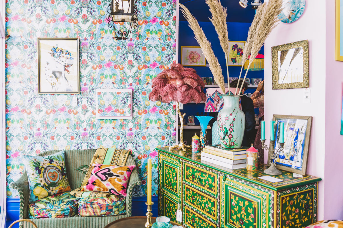 El showroom tiene colores vivos y estampados únicos, donde la vista va sola de un lado a otro. Desde pequeños detalles como tazas de té en forma de pétalos y velas de cerámica de lujo hasta piezas de decoración más llamativas, como por ejemplo un armario-aparador de cristal, el local está lleno de inspiración para aquellos que quieran añadir un toque de color a su hogar. Ambos diseñadores han combinado sus estilos a la perfección, usando colores complementarios para crear algo que evoca a un “sueño tropical”.