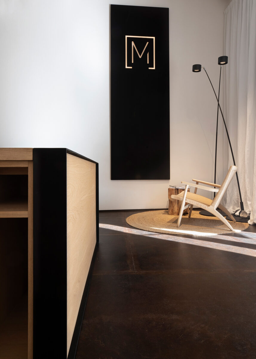 La amplia renovación y reforma se llevó a cabo en colaboración con Ángel Martín Interiores, que propuso una distribución centralizada con una gran mesa como eje central. Esto permite la libre circulación a su alrededor y facilita la interacción del equipo, un concepto central de este estudio. Entre los elementos que se conservan están las columnas industriales de hierro, el techo de vigas de doble altura y las puertas delanteras de madera tallada. Estos elementos contrastan hábilmente con un esquema de color minimalista y nítido que combina tonos de óxido y roble sobre un fondo blanco y negro.