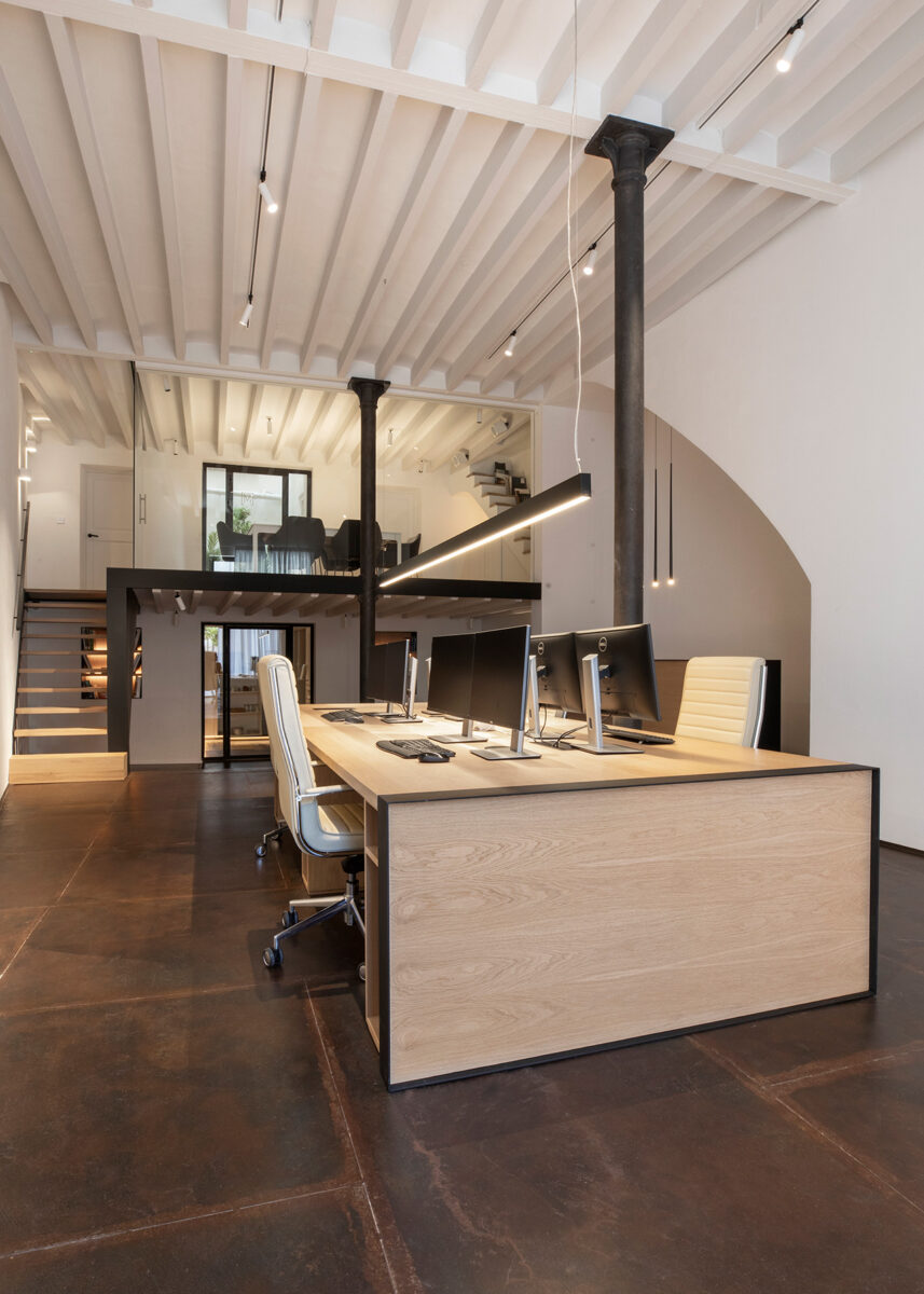 El local para el nuevo estudio ofrecía primero un gran espacio para trabajar, y situado en la céntrica Plaça Banc de l’Oli del casco antiguo de Palma, a pocos pasos de la plaza principal. Había pasado por muchas encarnaciones a lo largo de los años, incluyendo una tienda de frutas y verduras. El espacio, despojado, tenía un aspecto industrial que “se convirtió en la base del diseño de todo el proyecto”, explica Ana Muntaner, arquitecta de Medina Architecture Studio.