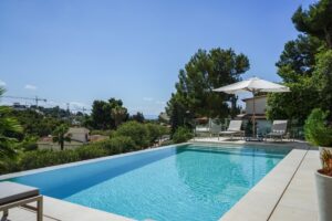 A diferencia de otras propiedades en venta en Portals Nous, esta villa cuenta con dos terrazas que dan a la extensa zona de la piscina y a los jardines con tranquilos rincones de lectura y zonas de descanso.