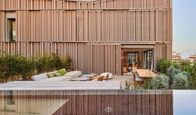 Así, desde la terraza sur podemos contemplar el salón como escenario de la vida cotidiana, con los campos y la sierra de Tramuntana panorámicamente recortados como telón de fondo”. Lo pequeño y sobre todo lo moderno es realmente hermoso. Y ¿quién necesita una pantalla artificial con unas vistas a la montaña como estas? Los responsables de este proyecto no se limitaron a hablar sobre la integración medioambiental. Con estilo y sustancia a partes iguales, utilizan métodos sencillos y eficaces para aportar frescor -como contraventanas mallorquinas y árboles de hoja caduca para dar sombra-, además de agua de lluvia almacenada para regar el jardín, llenar las cisternas de los inodoros y para la piscina.