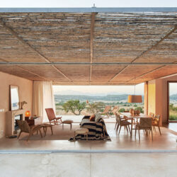 El suelo de cemento artesanal, la piedra de marés local, el enlucido rústico de mortero de cal y las tejas cerámicas reutilizadas se combinan brillantemente para lograr un acabado limpio y minimalista, en una paleta natural. El toque local se acentúa aún más en los muebles, ya que la mayoría fueron fabricados localmente por La Pecera, un fabricante artesano mallorquín. La conexión con el paisaje es fundamental para el proyecto. Una “lengua” de hormigón forma terrazas a ambos lados de la zona de estar, ampliando el espacio hacia el exterior, y las ventanas pueden ocultarse en los muros, borrando aún más los límites.