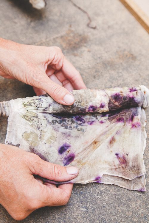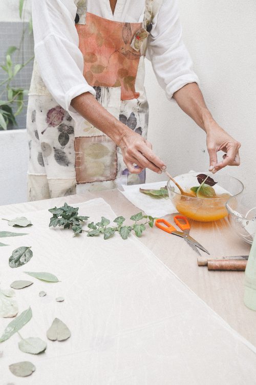 Es algo que también refleja la propia obra de Tatiana, centrada en la aplicación de tintes naturales sobre diferentes superficies, ya sea papel, seda o lana. Hace tres años, se apuntó a un taller de tintes naturales y enseguida conectó con ellos. Luego hizo un taller de estampación ecológica en el que flores y plantas se disponían sobre la superficie que iba a ser estampada. En la tienda, tiene una selección de fulares teñidos con aguacate y una maravillosa lana multicolor, tratada con ingredientes tales como aceitunas negras y cúrcuma.