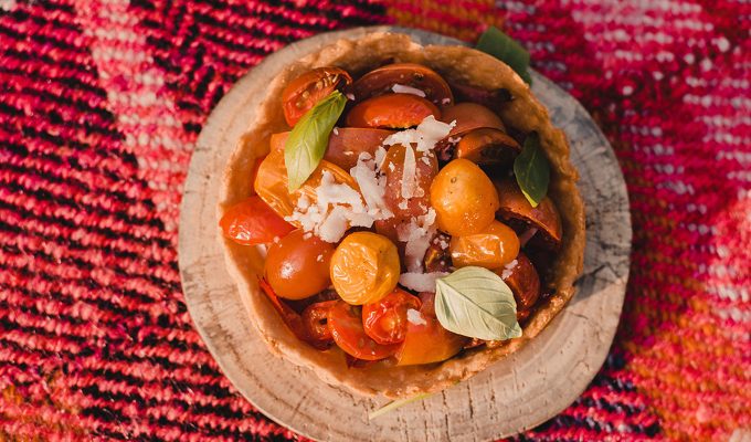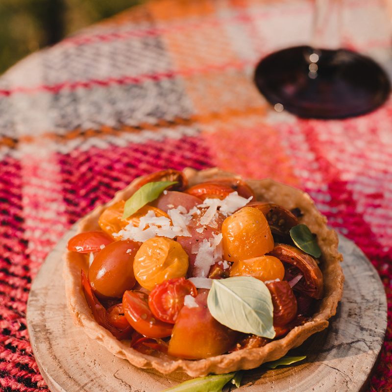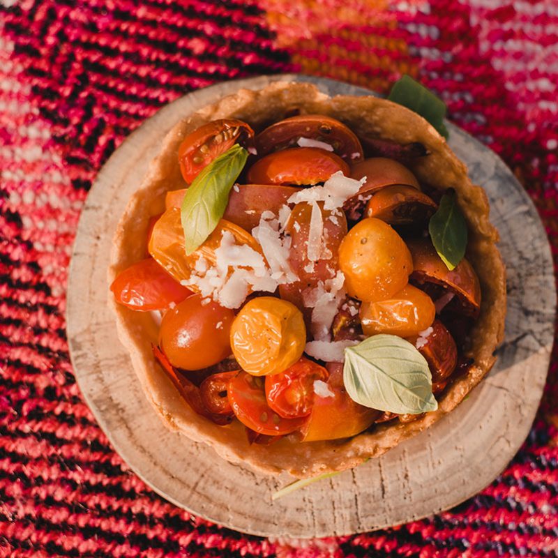 La comida ideal para el pícnic, estas sabrosas y gustosas tartaletas están rellenas de pimiento rojo salteado, pimentón, tomates y albahaca, todo ello revestido de una deliciosa masa quebrada. ¡Utiliza diferentes variedades de tomate cherry para embellecerlas!